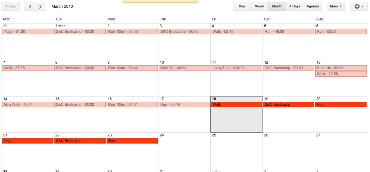 Like any goal, I believe you need two things - A Plan and a Tracker. I find a plan helps me think and smartly schedule my week. I used Google Calendar (free) every Sunday to block in what activity I was doing each day. It wasn't set in stone so I was free to move workouts around (e.g. Walk on a day I didn't want to run or Yoga on a really wet day instead of having to go out in the rain). Having a plan also helped by making me commit to a time to get something done. As I use Google Calendar for my own reminders, so for example, if I knew I had something planned for some evening, I would do my workout in the morning. Having this planned out made sure I didn't find myself in a time compromise.